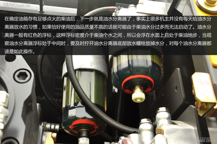 在確定油箱存有足夠點火的柴油後,下一步就是油水分離器了,事實上很多機主並沒有每天給油水分離器放水的習慣,如果恰好使用的油品質量不高的話就可能由於柴油水分過多而無法啟動了。油水分離器一般有紅色的浮標,這種浮標密度介於柴油個水之間,所以會浮在水麵上且處於柴油地步,當觀察油水分離器浮標處於中間時,要及時擰開油水分離器底部放水螺栓放掉水分,對每個油水分離器都該是如此操作。