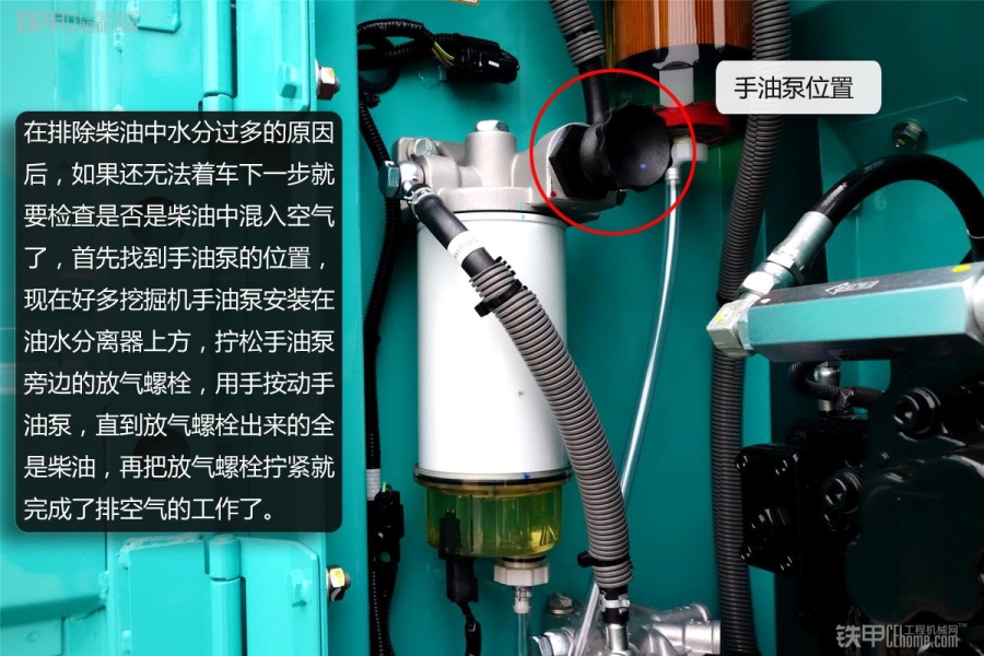 在排除柴油中水分過多的原因後,如果還無法著車下一步就要檢查是否是柴油中混入空氣了,首先找到手油泵的位置,不同品牌的發動機手油泵安裝位置不同,有的是安裝在柴油泵附近,有的是外加了電子油泵所以就不需要手動排空氣,目前在售大部分挖掘機手油泵安裝在油水分離器上方,擰鬆手油泵旁邊的放氣螺栓,用手按動手油泵,直到放氣螺栓出來的全是柴油,再把放氣螺栓擰緊就完成了排空氣的工作了。